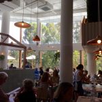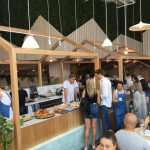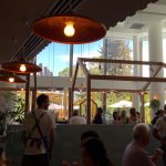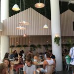 The cafe is positioned in a courtyard amongst some other businesses and boasts river views from its outdoor seating. The interior follows the increasingly popular large open space style with a high ceiling that’s bordering two storeys, floor to ceiling windows around the periphery and an array of hanging lights. A timber structure resembling a small house frame is built around the centred bar and counter area to give the illusion of a building inside a building. The walls are mostly lightly stained timber with the upper half styled like the outline of a series of peaked roof buildings. Synthetic grass creatively fills the gaps between the peaks up to the ceiling. Ferns, creepers and basket plants are scattered throughout the venue to add a bit of green.